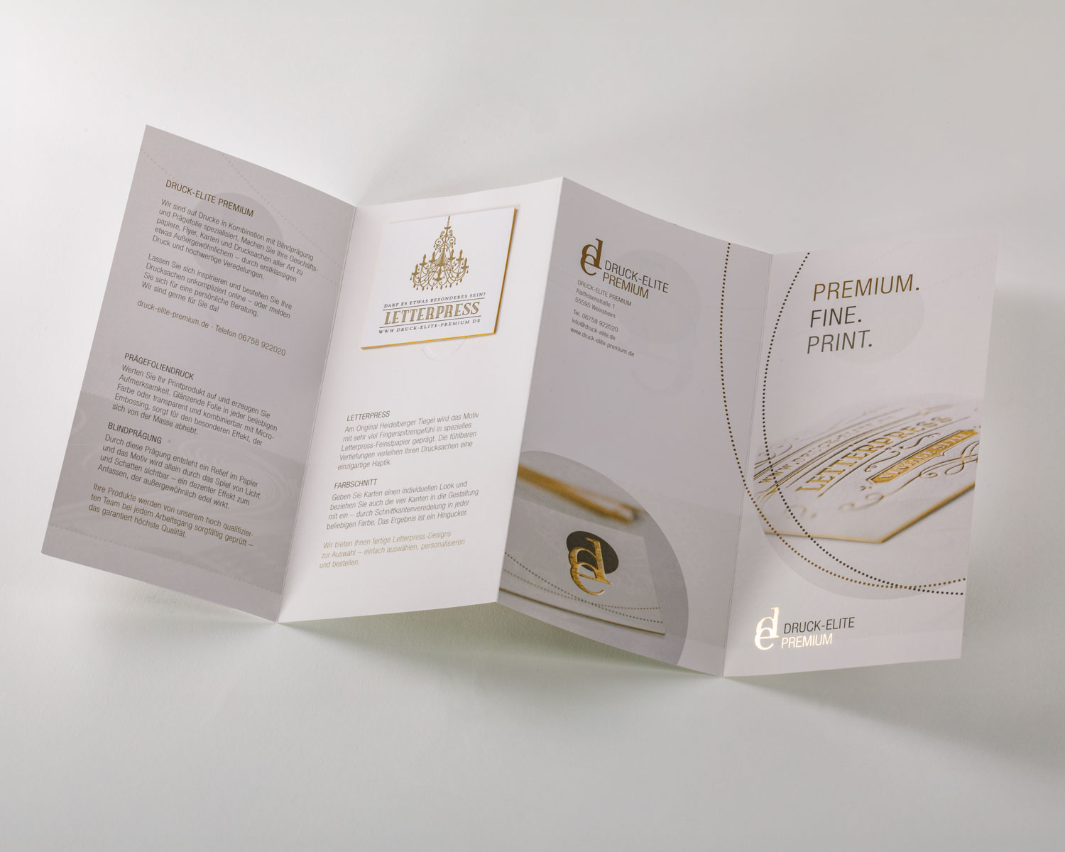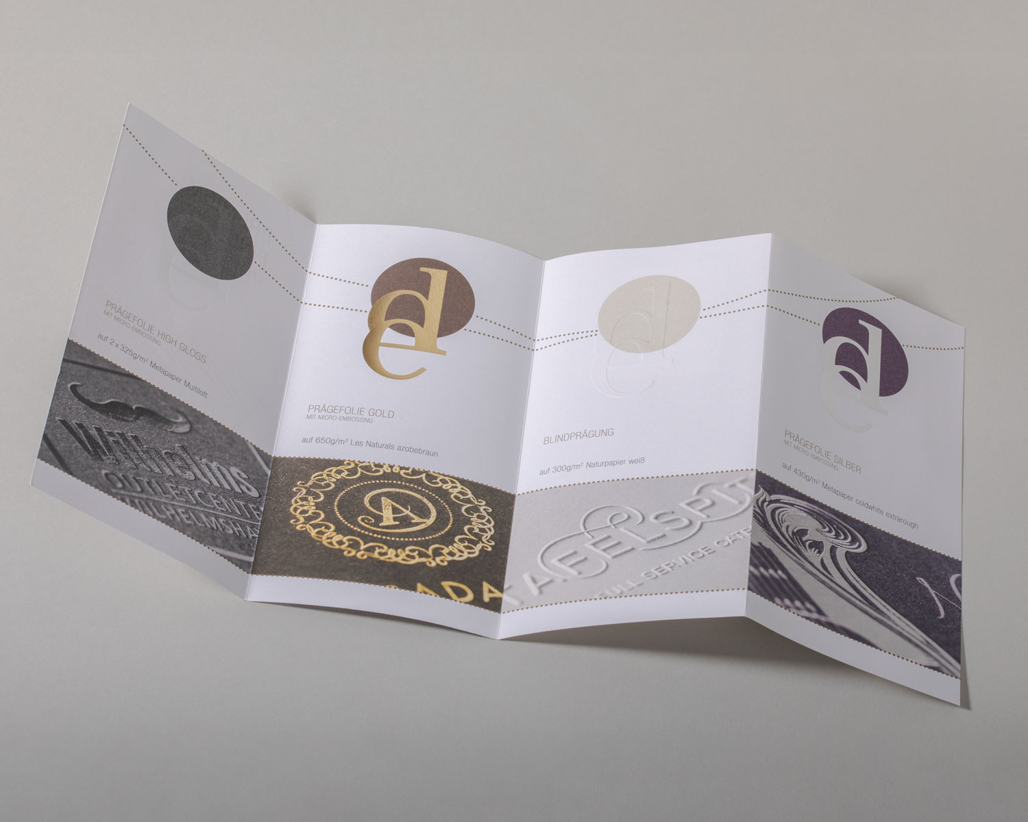 Der Flyer veranschaulicht und beschreibt Veredelungstechniken die wir anbieten, wie bspw. Blindprägung, Prägefolie Gold, Silber und High Gloss. Wir beraten Sie gerne persönlich bei der Papier- und Veredelungsauswahl.